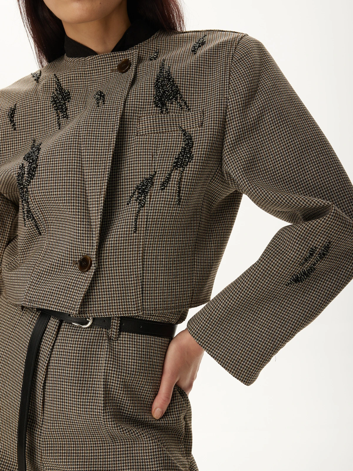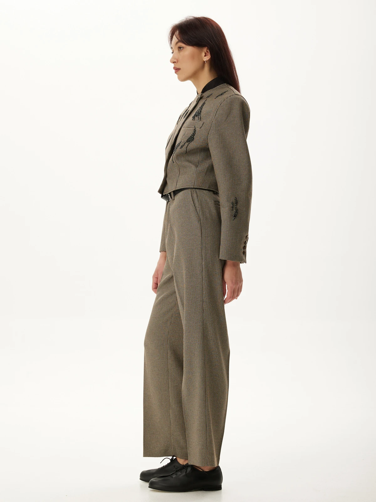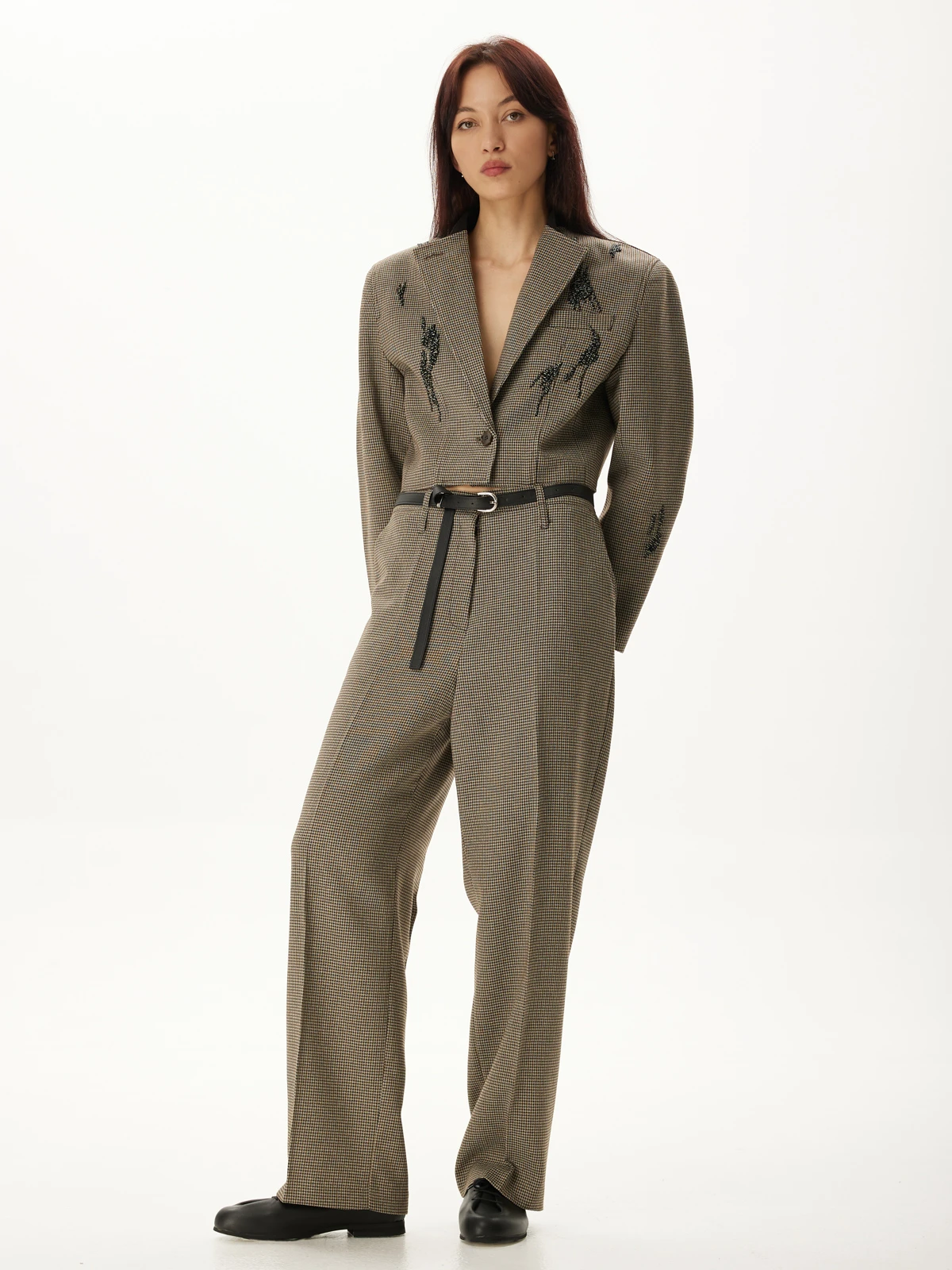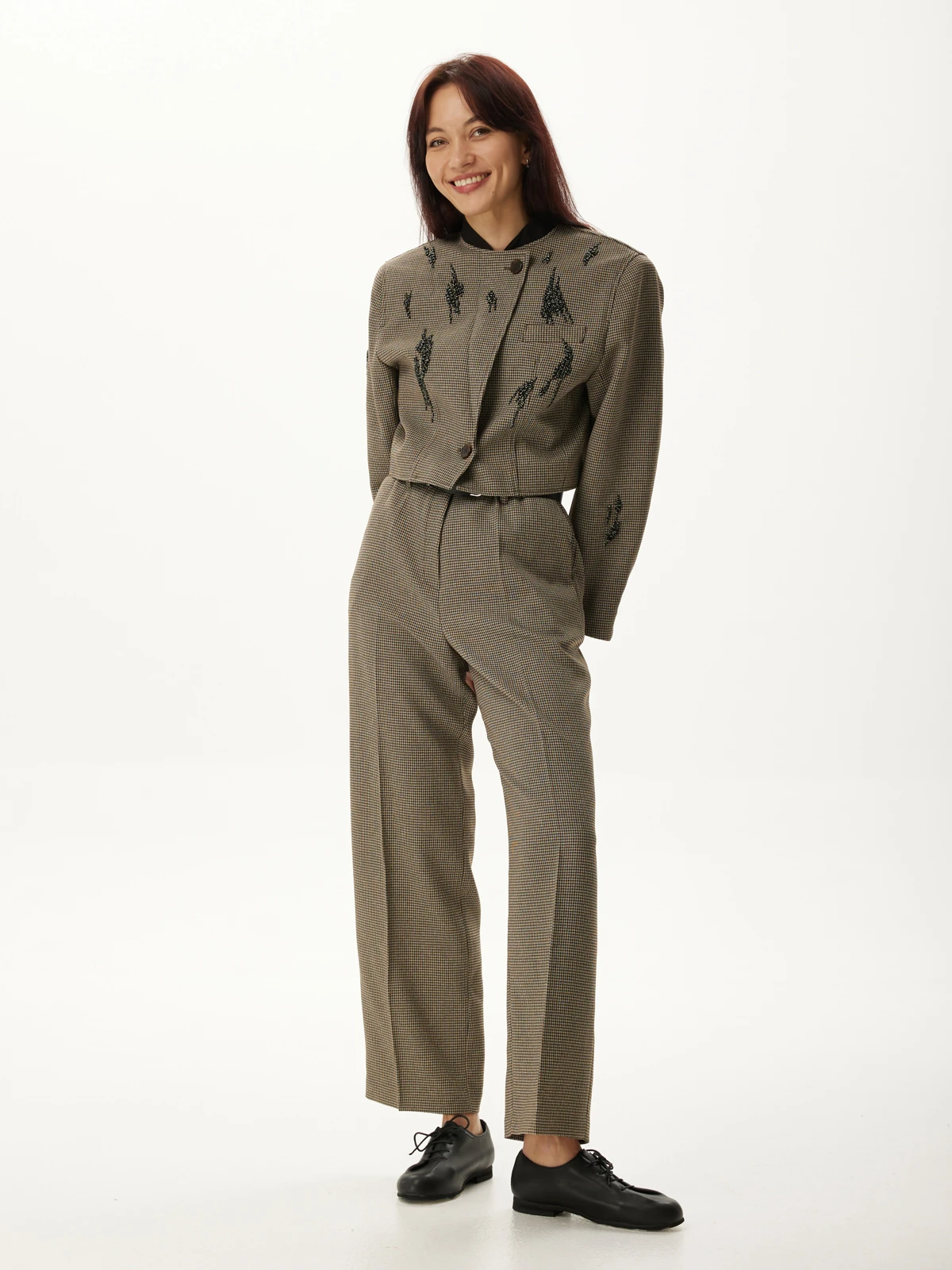 Идеальная посадка брюк: Брюки скроены с учетом анатомических особенностей, гарантируя идеальную посадку, которая визуально удлиняет ноги и создает гармоничный образ. Классический и всегда актуальный принт "гусиная лапка" добавляет костюму утонченности и характера, делая его заметным и стильным. Роскошное декорирование жакета высококачественными камнями придает ему поистине королевский вид. Мерцание камней при каждом движении завораживает и притягивает взгляды.