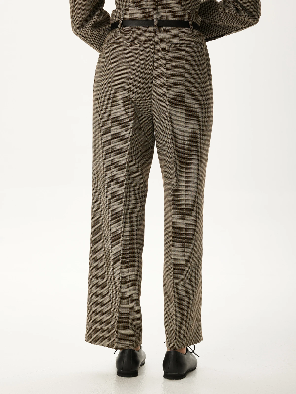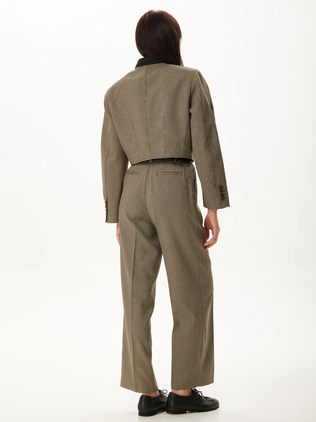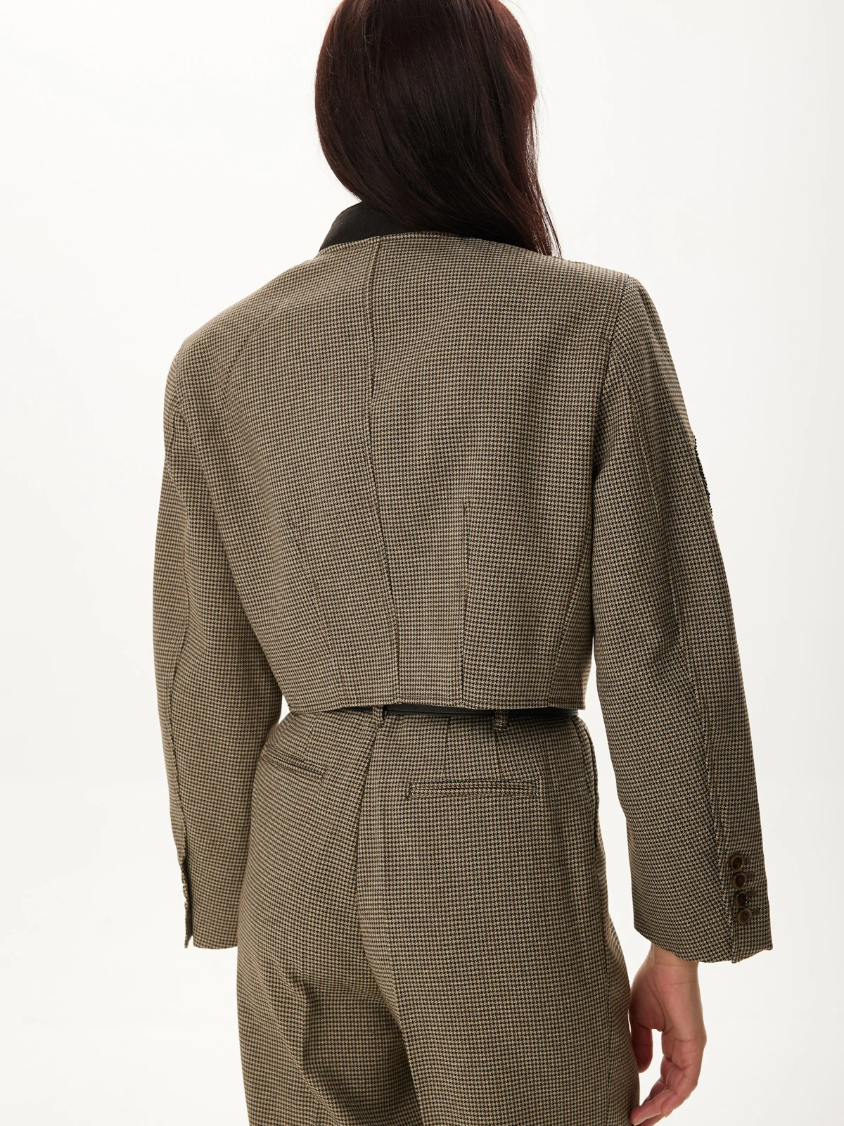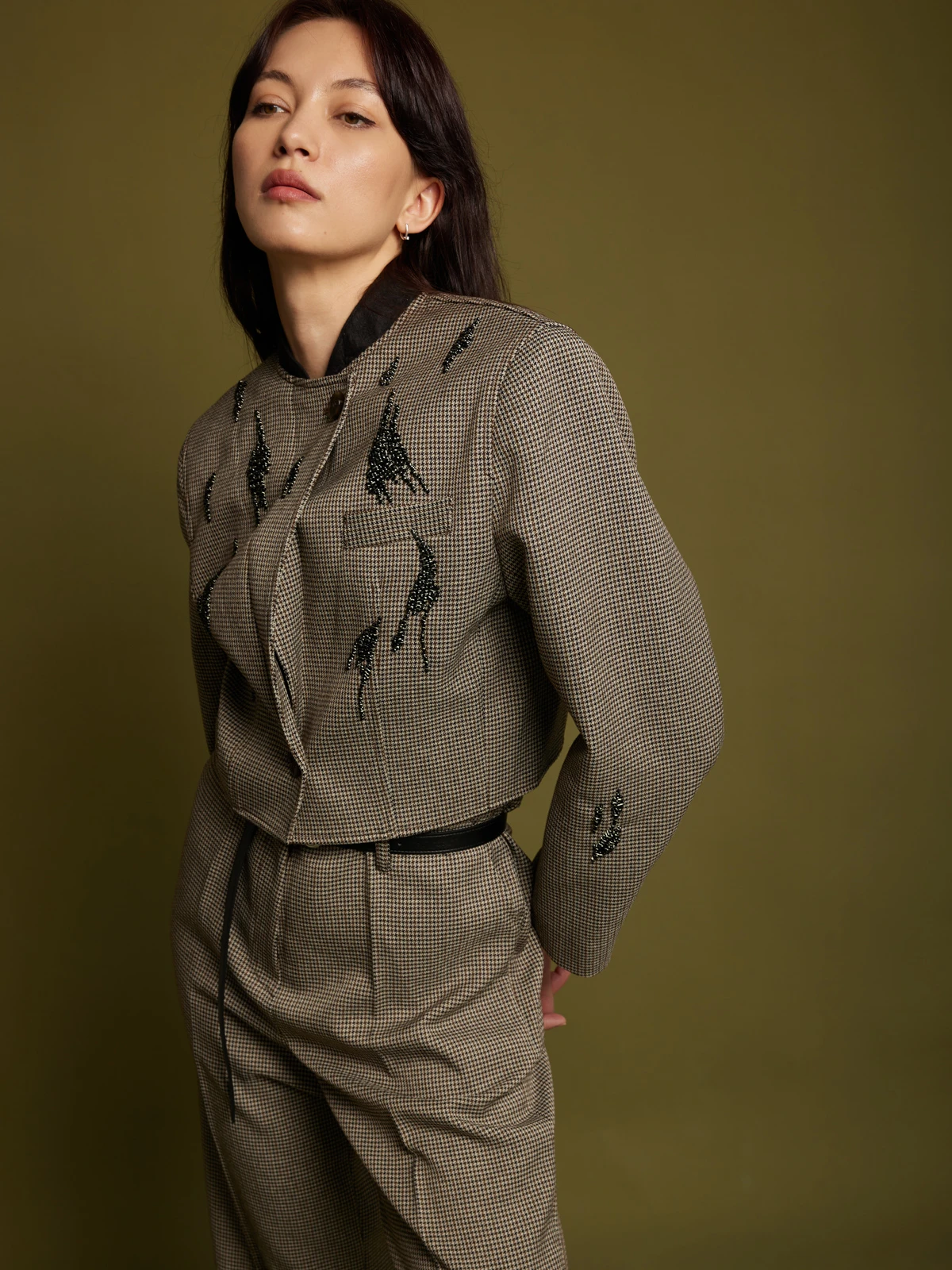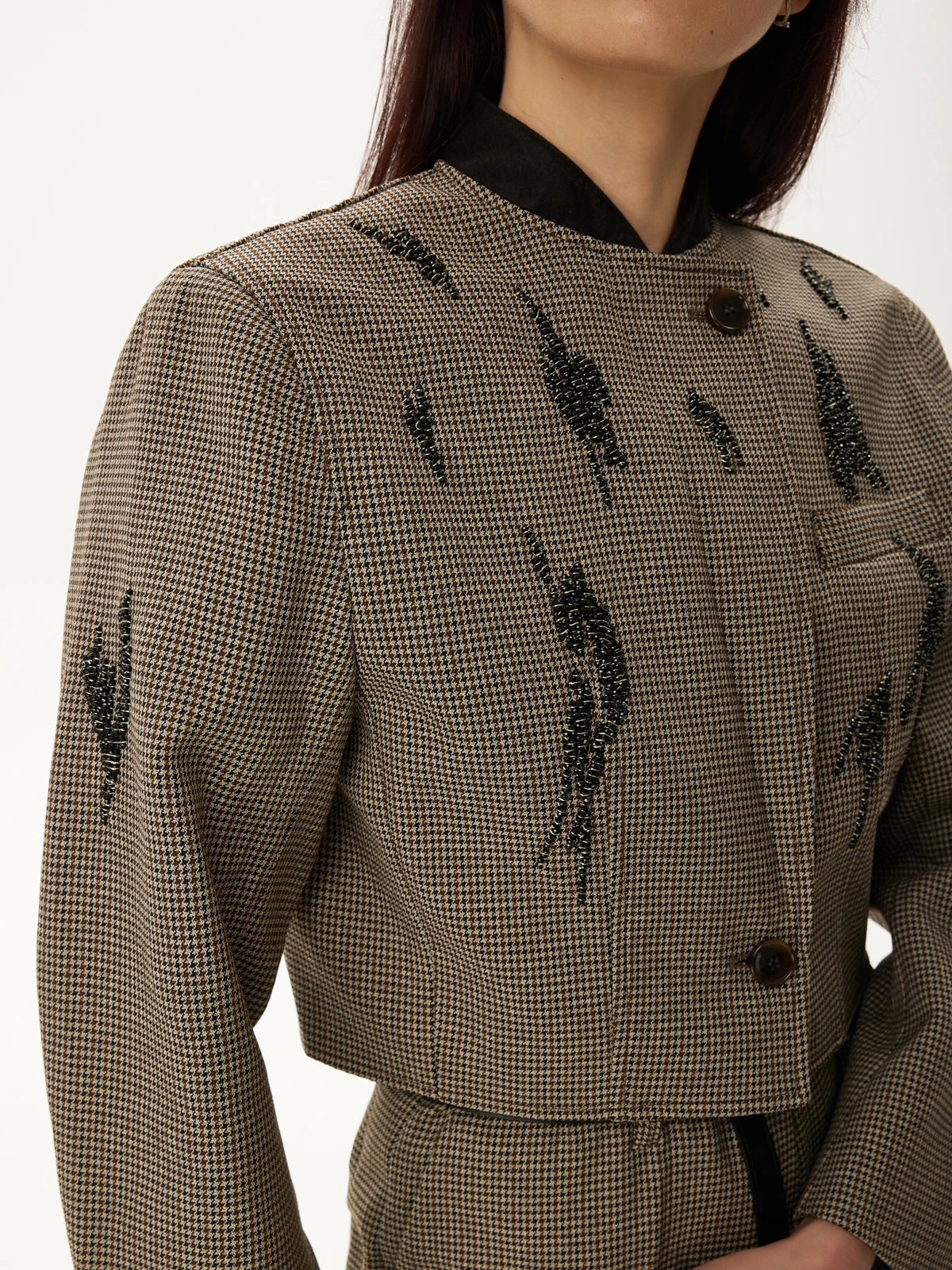 Идеальная посадка брюк: Брюки скроены с учетом анатомических особенностей, гарантируя идеальную посадку, которая визуально удлиняет ноги и создает гармоничный образ. Классический и всегда актуальный принт "гусиная лапка" добавляет костюму утонченности и характера, делая его заметным и стильным. Роскошное декорирование жакета высококачественными камнями придает ему поистине королевский вид. Мерцание камней при каждом движении завораживает и притягивает взгляды.