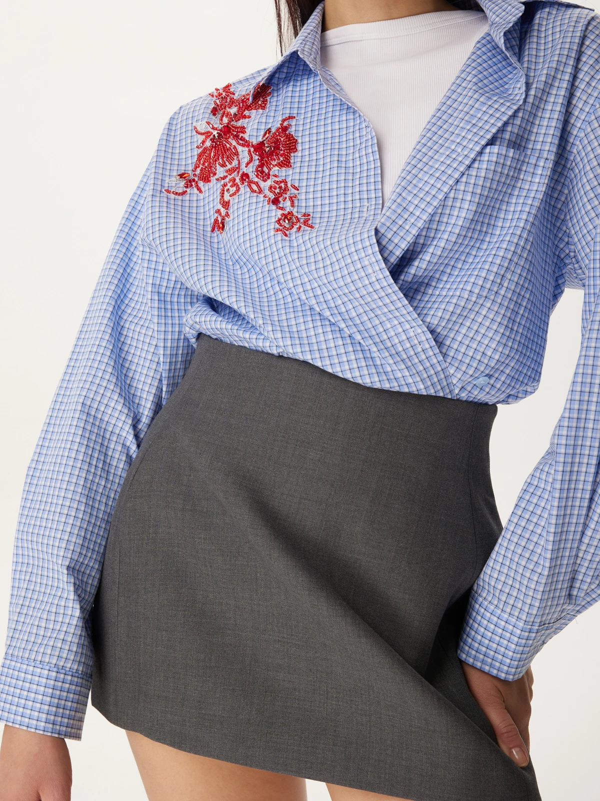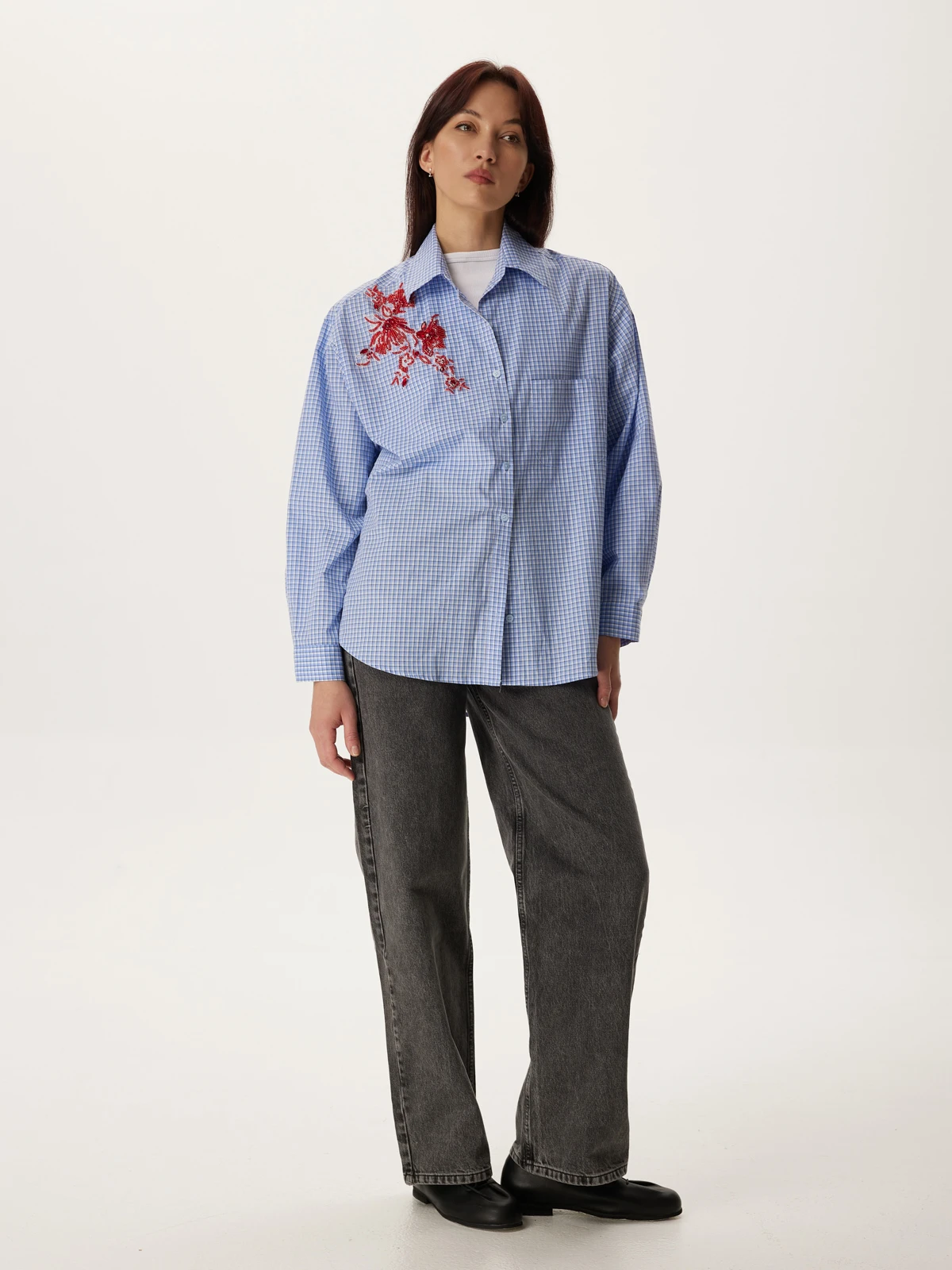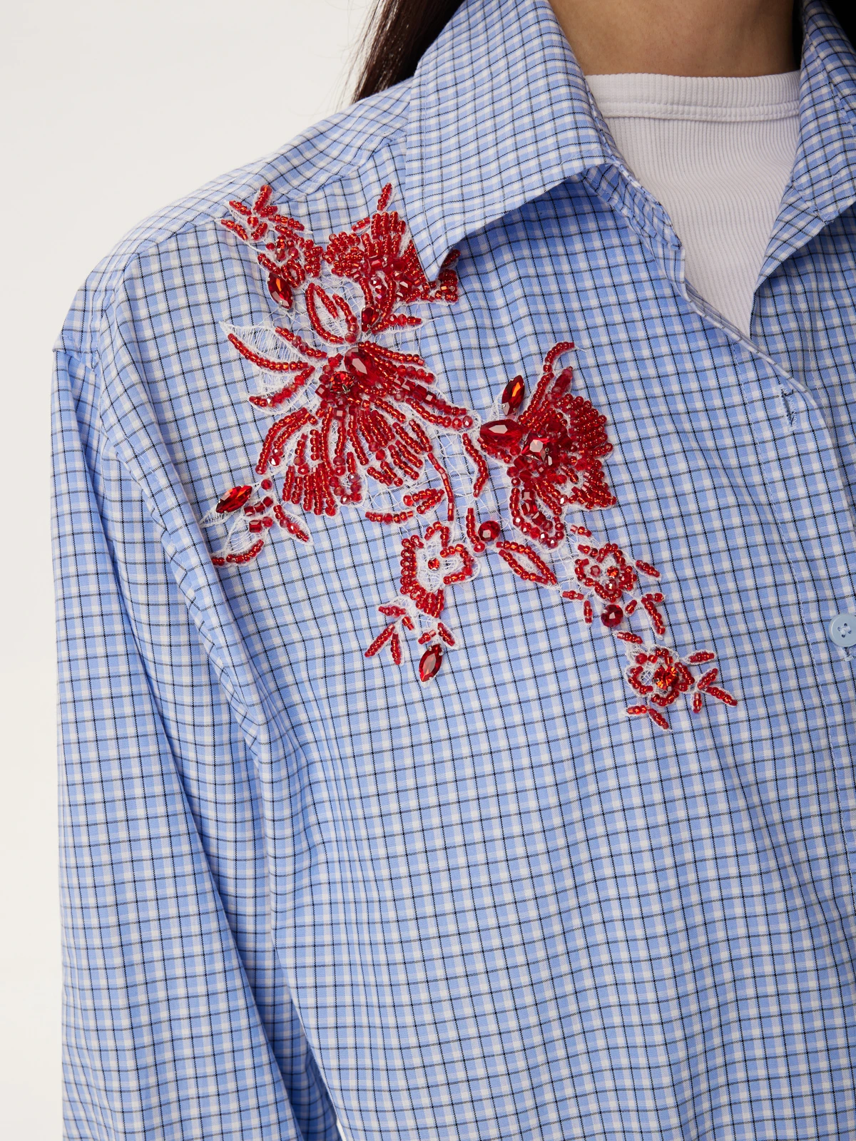 Истинная магия этой рубашки раскрывается в ее роскошном декоре. Красное тончайшее кружево, словно искра страсти, смело контрастирует с нежностью голубой клетки, добавляя изделию дерзости и выразительности. Это смелое сочетание, в котором чувственность кружева встречается с классической строгостью клетки, рождает поистине уникальное творение.